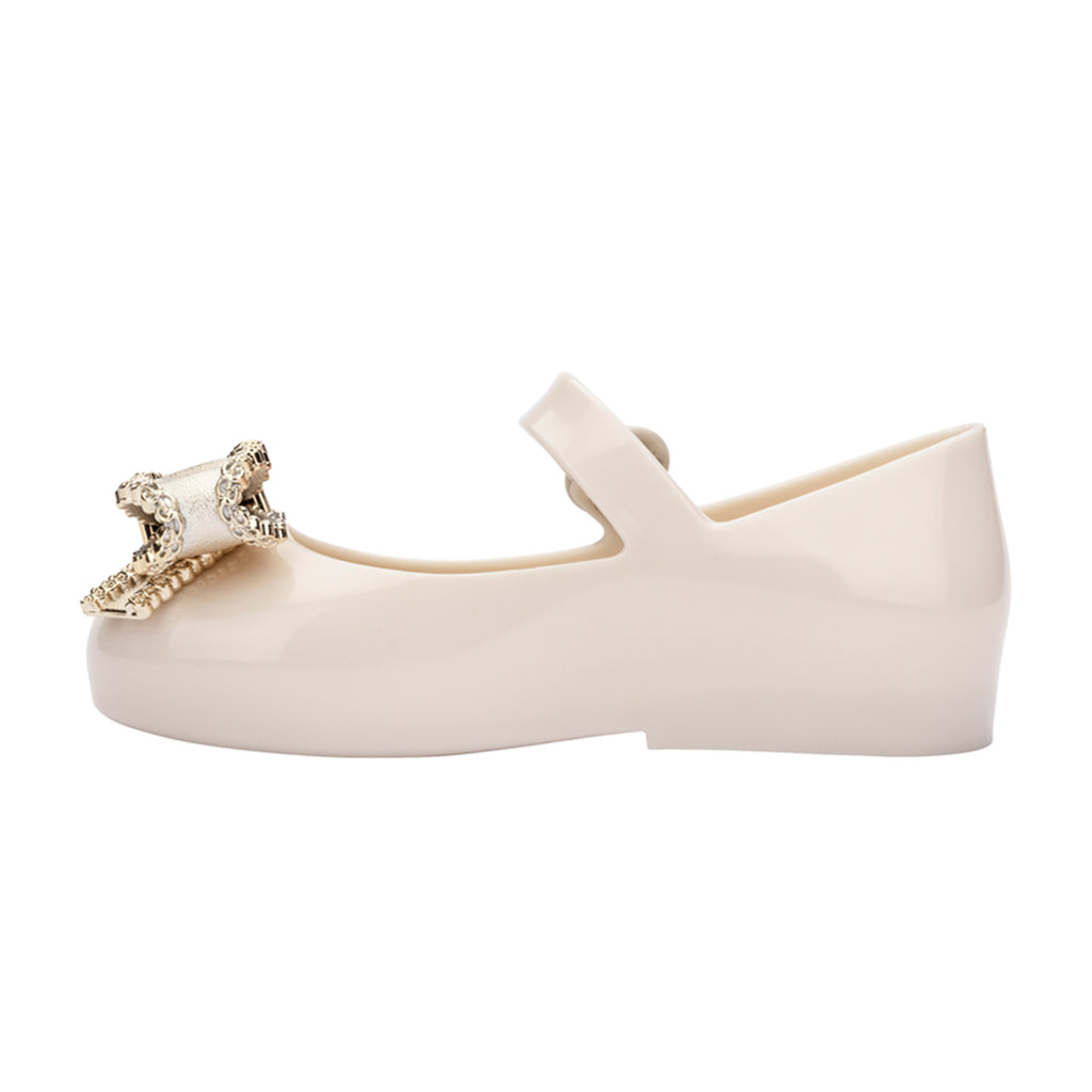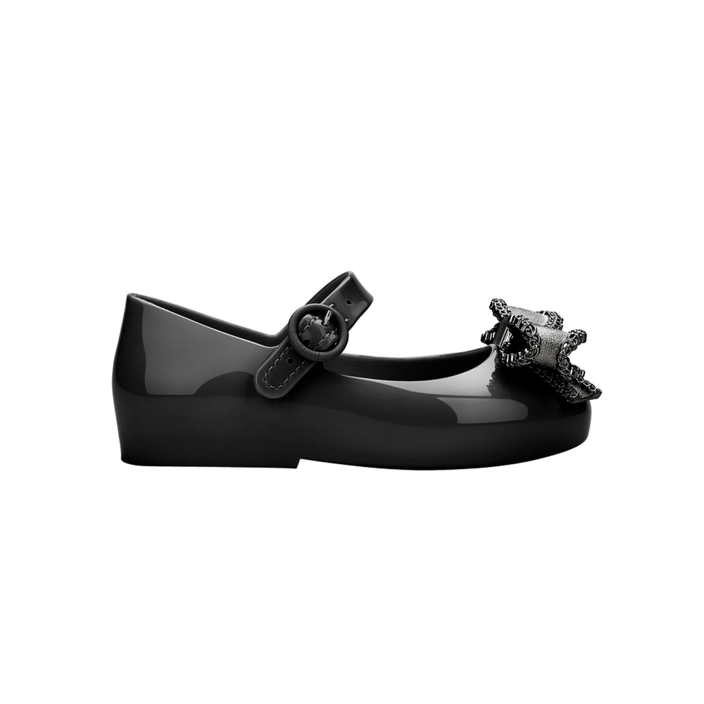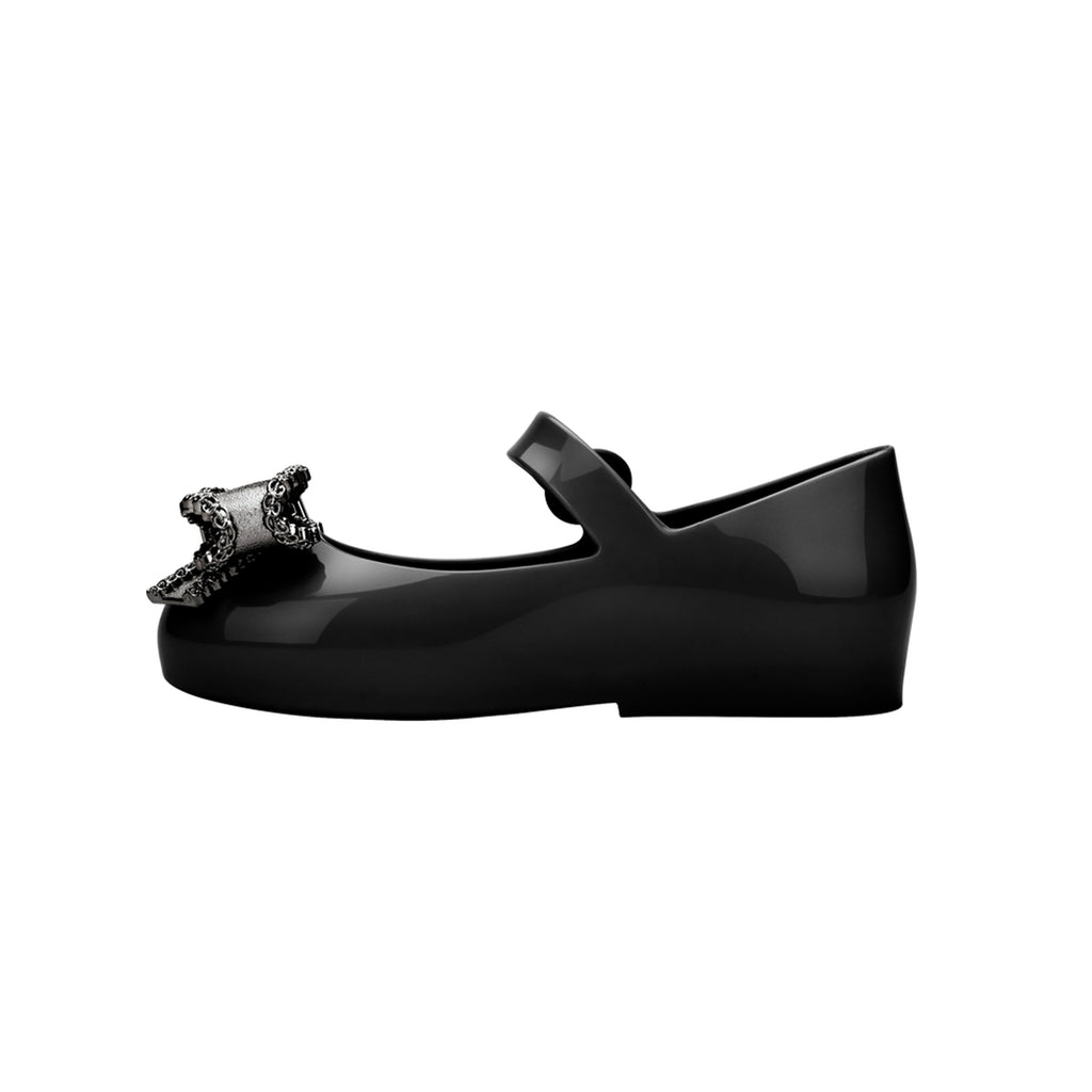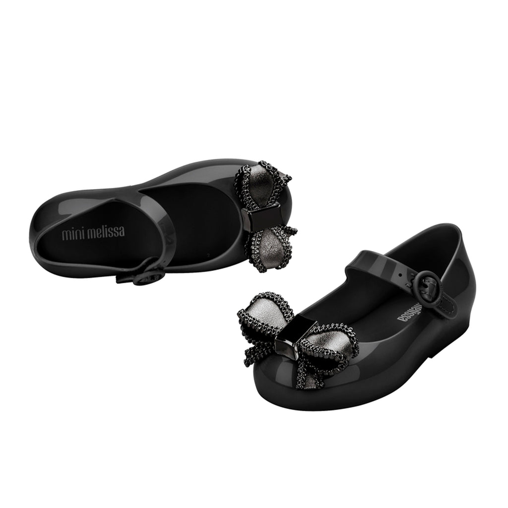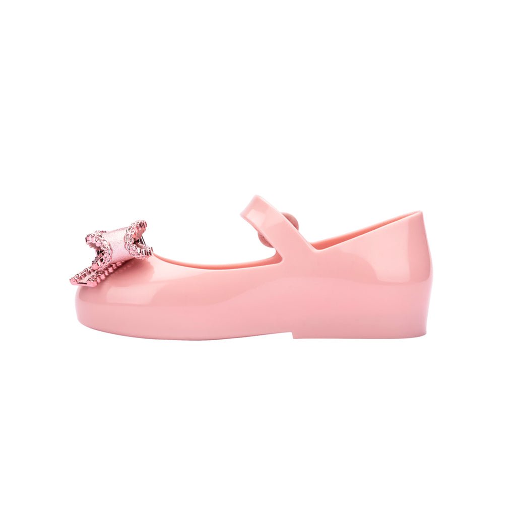 Pair up with your little one in the Mini Melissa Sweet Love IV Baby! In colours and details exactly like the women's version, these straped ballerinas are just too adorable to miss! With the usual yet necessary features that allow for safe, yet fashionable wear, Mini Melissa Sweet Love IV is a glittery, feminine, princess-like pair with giant ribbon appliques laced with chrome outlines. An overstrap to help keep the shoe secure for running and climbing, the footbed inserts are thickly padded to ensure good shock absorption and protection for tiny feet. Scented and available in the best colours, keep this pair handy as it is great for all occasions, casual and fomal alike!