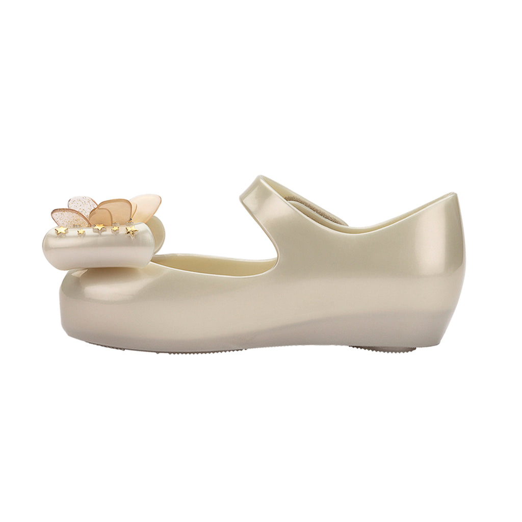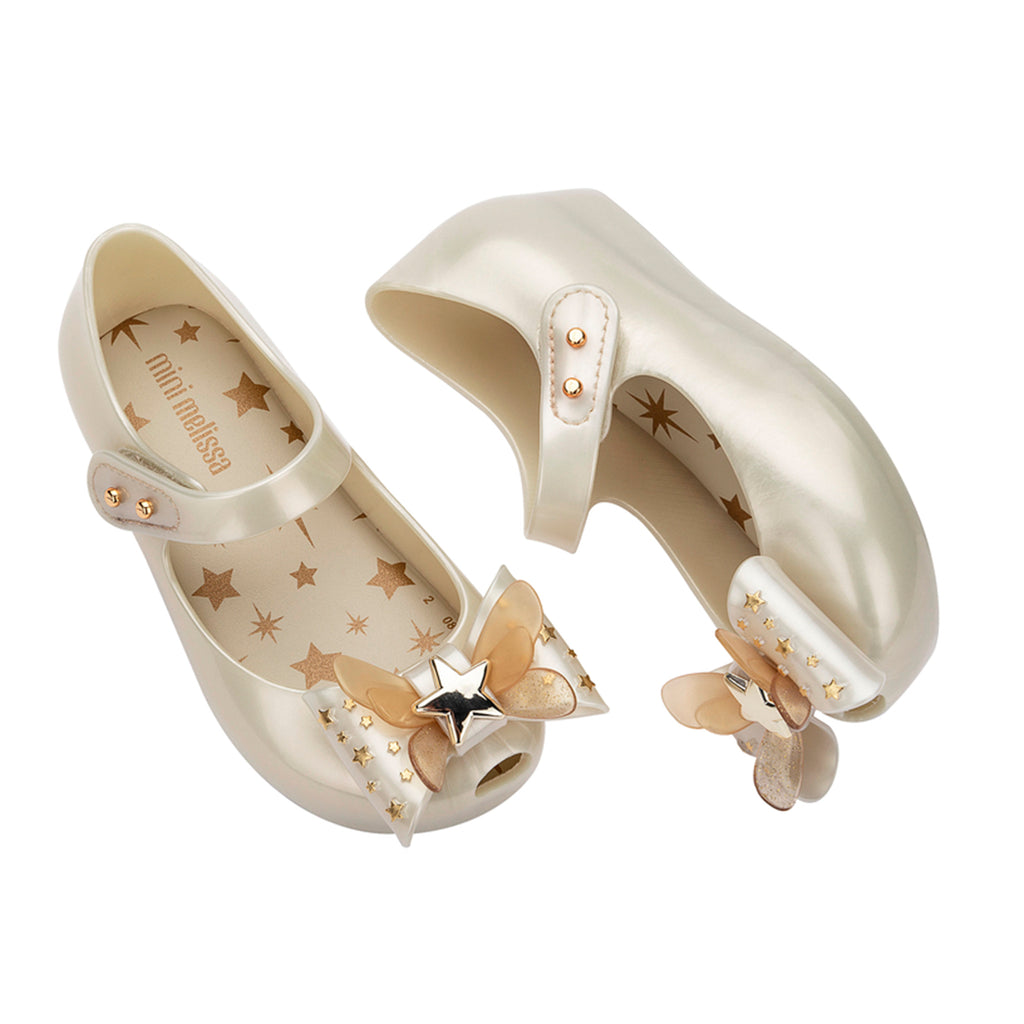 Introducing the adorable Ultragirl Star II, the ballet flat that shines like a star! This special version of the model features an extra strap over the instep, secured with a pin closure, providing greater stability for growing little feet. The highlight of this classic Melissa footwear is the double maxi bow adorning the toe, adorned with a charming starry pattern and a silver star at its center. Stars also embellish the insole, which is soft and extremely comfortable, ensuring maximum well-being for the little ones. With a super feminine touch, these ballet flats are the perfect choice for girls to wear in all seasons, with or without socks.