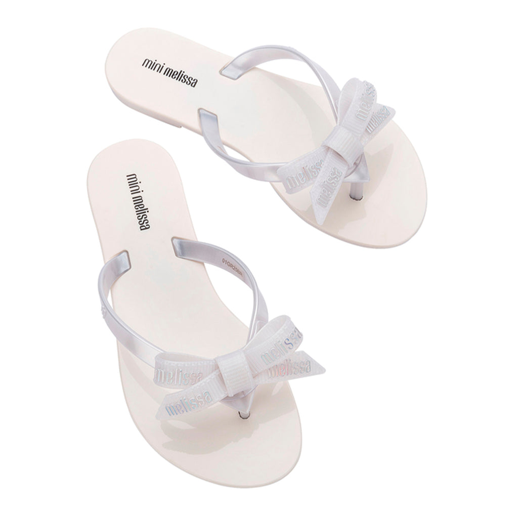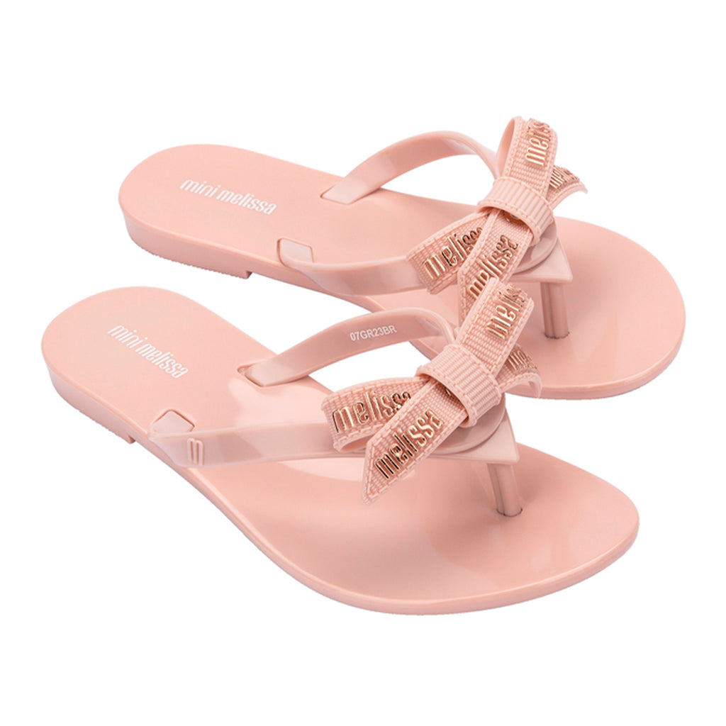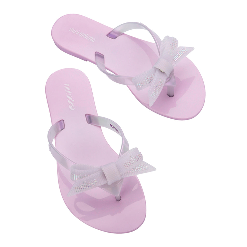 Step into summer with Mini Melissa Harmonic M Lover flip flops. The delicate bow, adorned with the iconic Melissa logo adds a romantic touch to this timeless silhouette. These are ultra-lightweight and practical, making them the perfect choice for every warm-weather outfit. Plus, you can match your mini! Flip flop sandal style Light-as-air construction Made with wear-resistant Melflex Melbubble sole for durability and comfort Decorative textured bow Upper: 98% PVC + 2% metal Sole: 100% PVC Bubblegum scent.