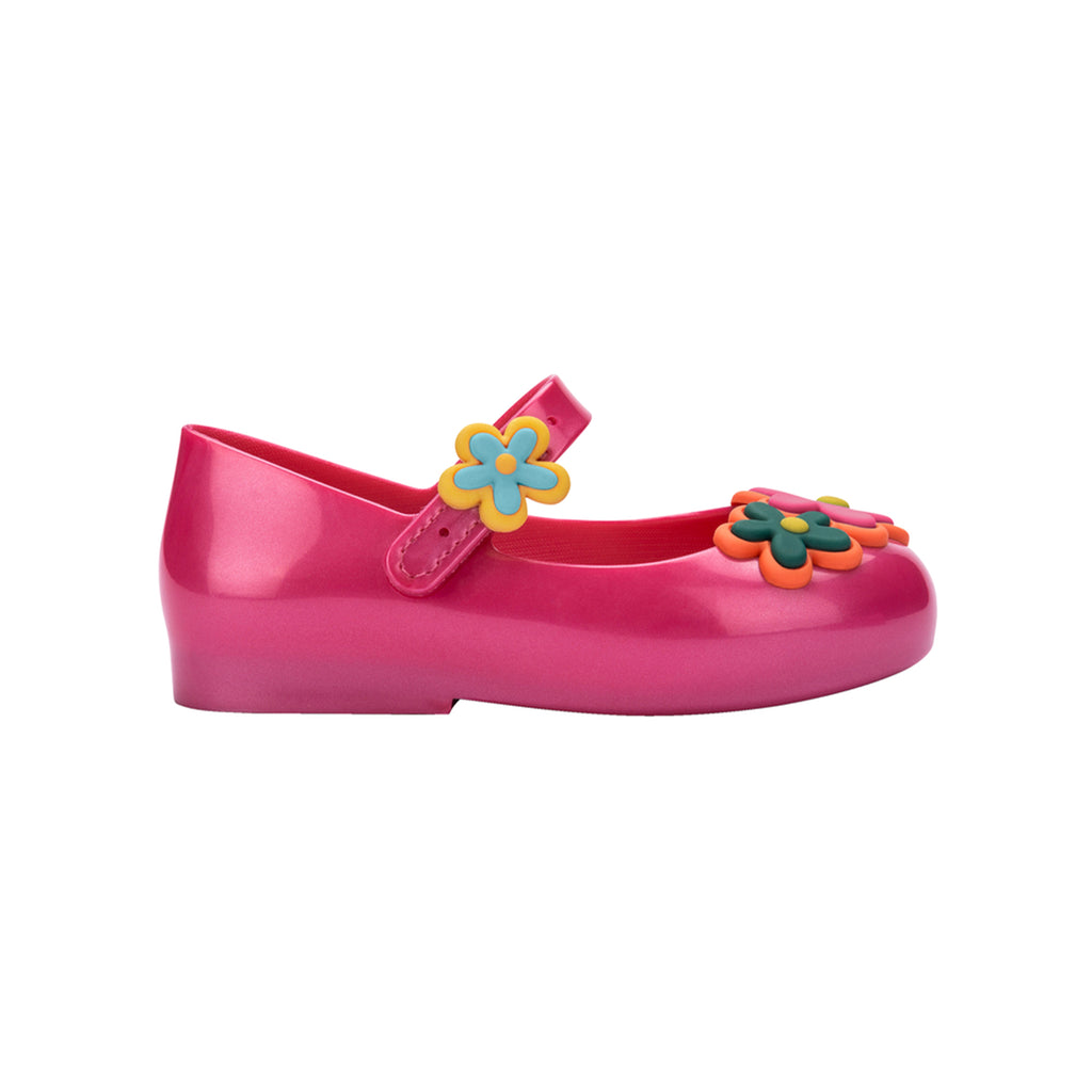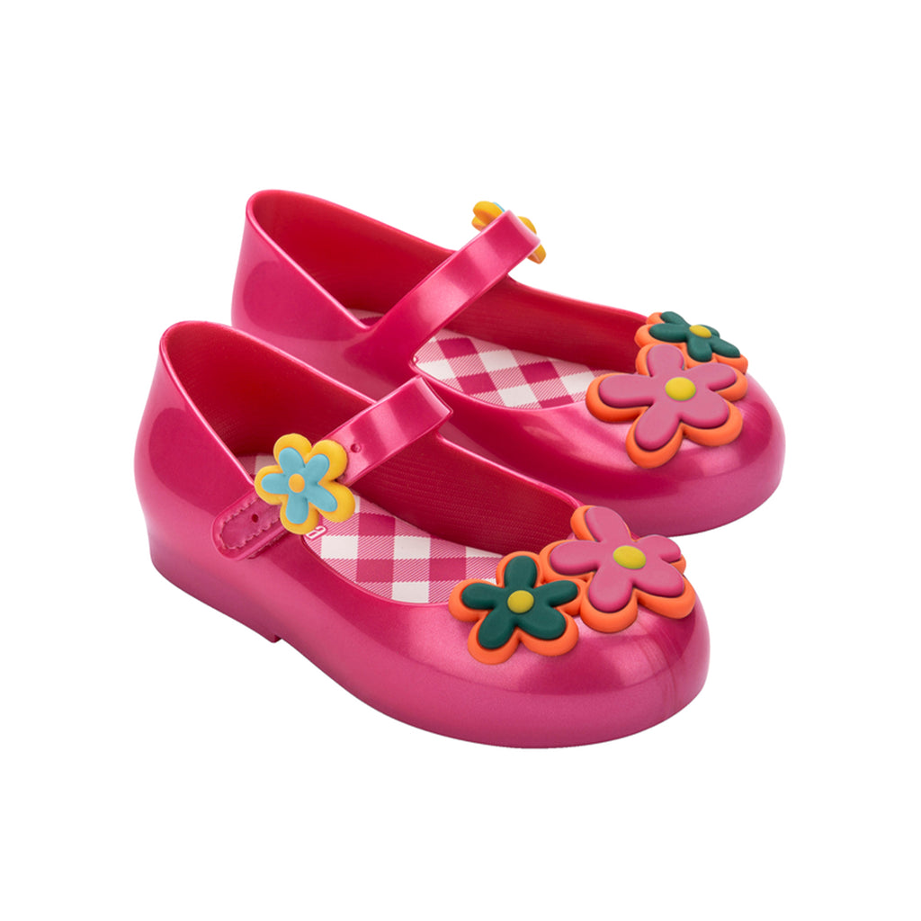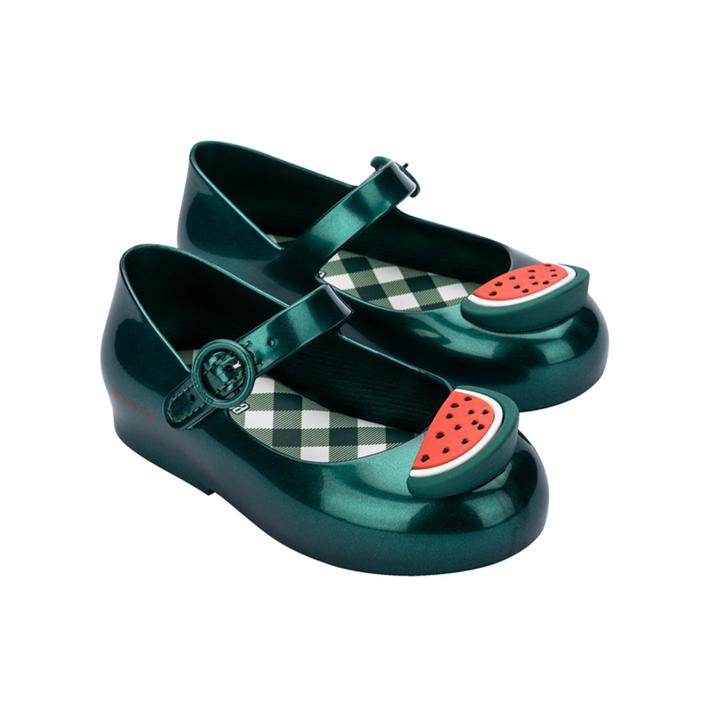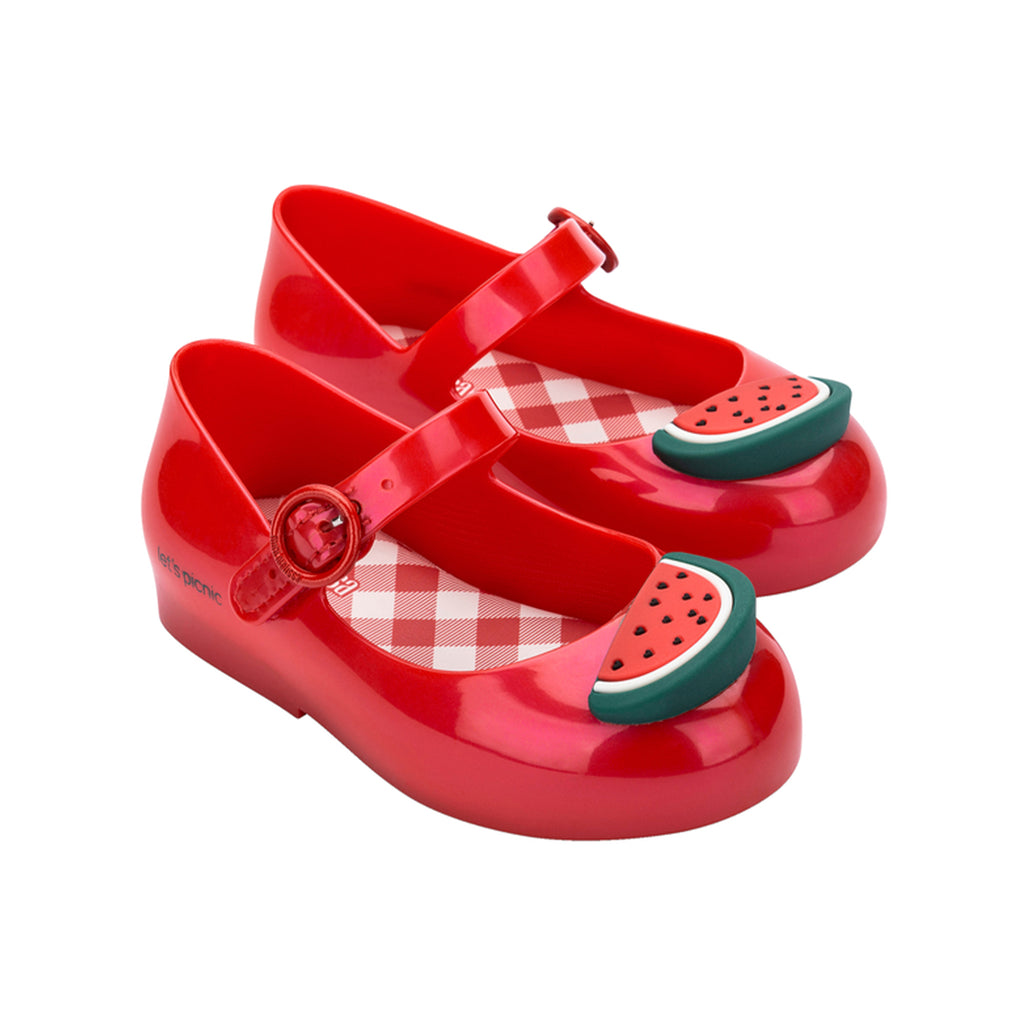 There's nothing sweeter than a picnic in the park with fresh watermelon, flowers, and your best little buds. The Sweet Love Picnic Ballerina Flat is adorned with the cutest details, plus adjustable buckle straps for all-day security and comfort. Fun floral and watermelon embellishments Adjustable buckle Gingham-patterned insole Upper: 94% PVC + 4% Velcro + 2% metal Insole: Laminated PVC Sole: 100% PVC Bubblegum scent